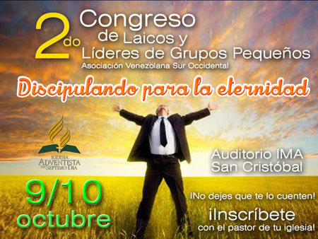 Es por ello que nos alegra confirmar la realización del Congreso de Laicos y Líderes de Grupos Pequeños a celebrarse los días 09 y 10 de octubre del presente año, en el “Auditorio del Instituto Metropolitano Adventista de San Cristóbal”. Contaremos con la presencia del Pr. Fernando Toala, director de Ministerios Personales de la Unión Venezolana Occidental y el Pr. Osmar González, profesor del Seminario Teológico Adventista de Venezuela.